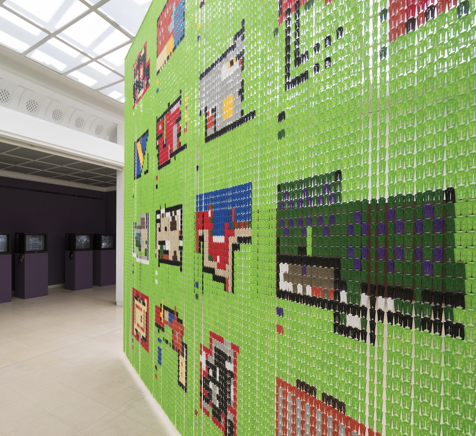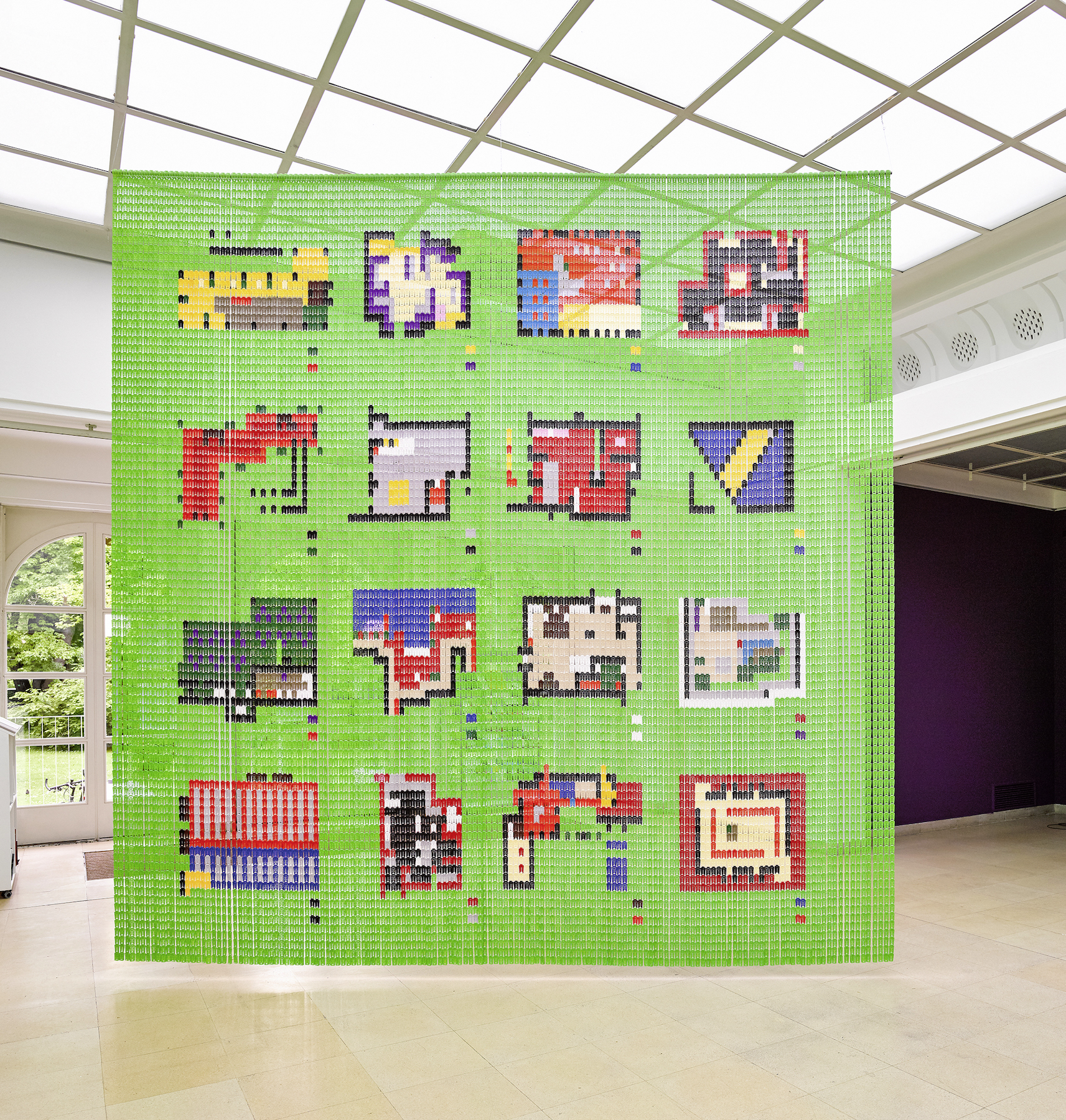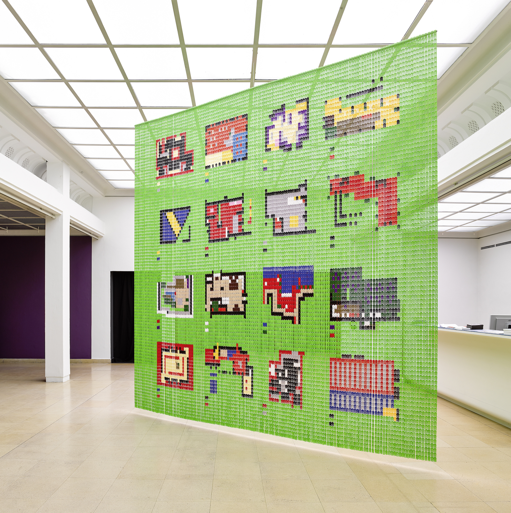 "A large, bright green curtain incorporates 16 colorful, geometrically arranged patterns, the surface character of which reminds of the visual design of video games in the 1980s. Comprising hundreds of identical plastic elements, the work uses a generic form of room divider in Italy – the “standard curtain” between inside and outside, between front room and back room, between public space and private retreat. In a way, Giacconi’s curtain too fulfills this function: two other components of his work are concealed behind it – a book and an audio piece.