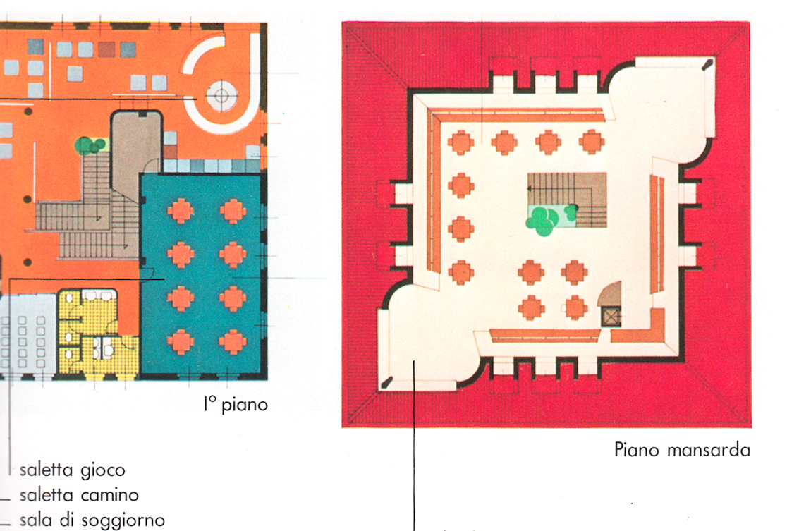 The curtain depicts a catalogue of forms, inspired by floorplans of buildings (realized and unrealized) conceived for Milano 2.