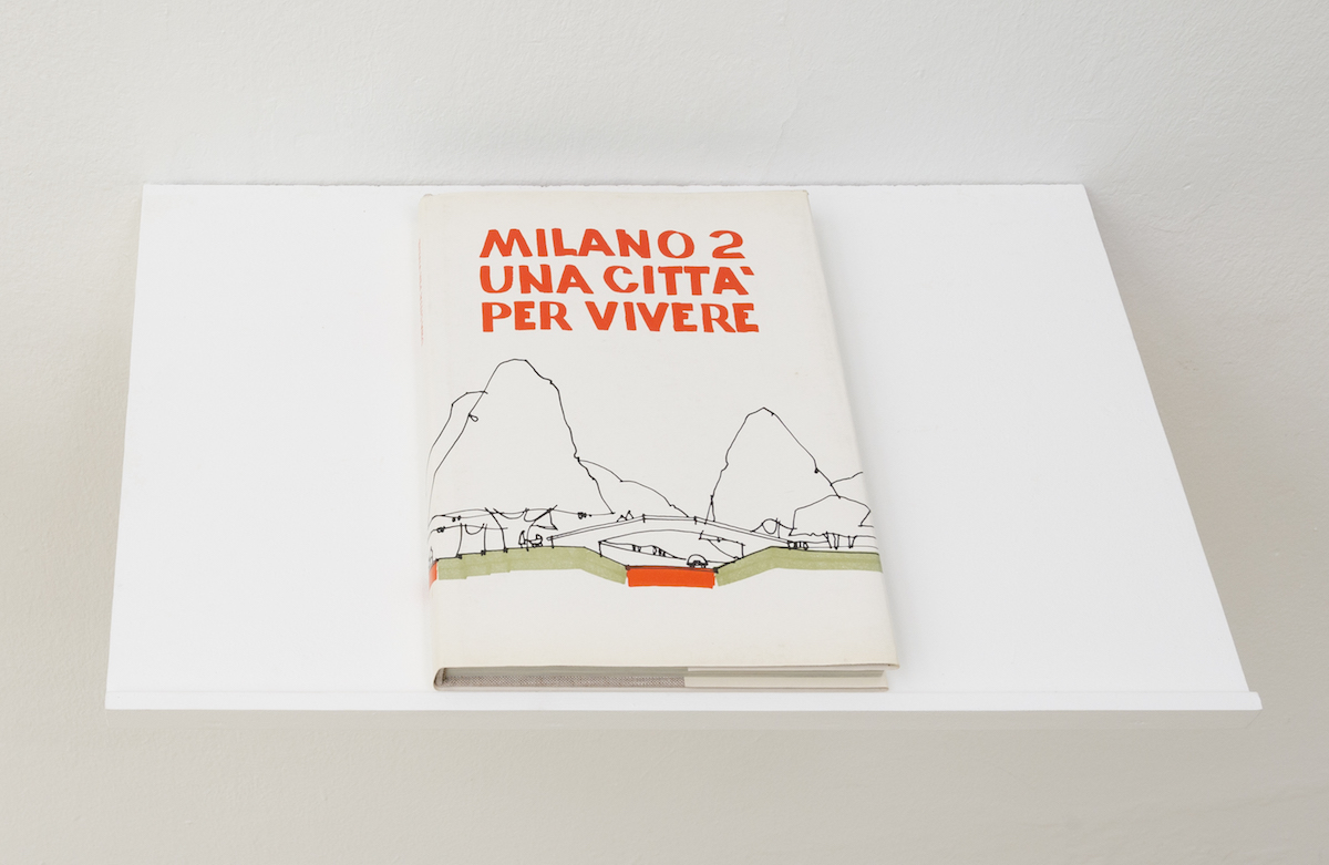 The display also includes a book, Milano 2. Una città per vivere, a 1974 publicity volume advertising Milano 2.