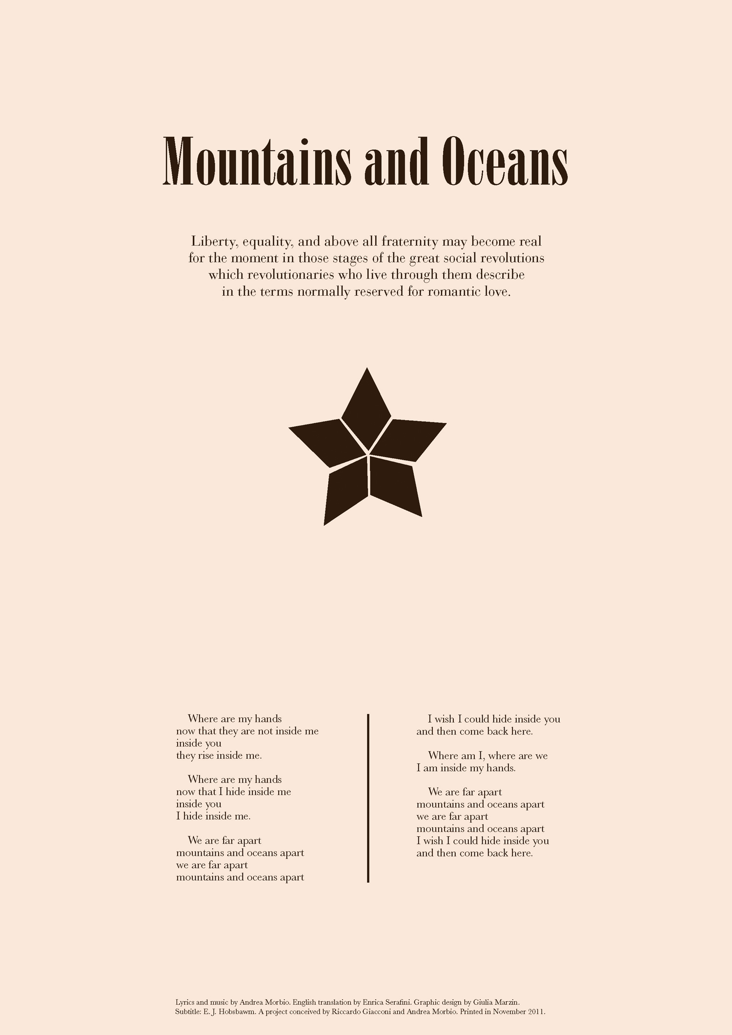 The third installment of the Pianetti project is a series of fogli volanti inspired by Simone Pianetti. At the center of each flyer is a love song, Monti e Mari (“mountains and oceans”), around which quotations and images are arranged.